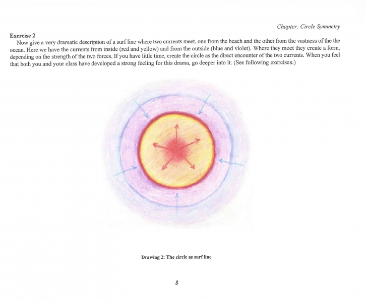 Auf dem zweiten Weg möchte ich stärker das künstlerische Empfinden der Kinder ansprechen und vor allem die Kreisform aus dem Zusammenwirken von Innerem und Äußerem auch farbig entstehen lassen. Dazu kommt eine drehende Bewegung. Diesen Weg konnte ich für die amerikanische Ausgabe farbig auf einer CD darstellen und füge den ersten Teil hier als Download bei.