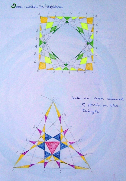 In der Freihandgeometrie sehe ich zwei mögliche Wege, die Sie nach Interesse und Zeit gehen können. Der erste Weg geht stärker traditionell vom Zeichnen einfacher geometrischer Formen oder Formenfolgen aus. Er ist in meinem genannten Büchlein beschrieben.